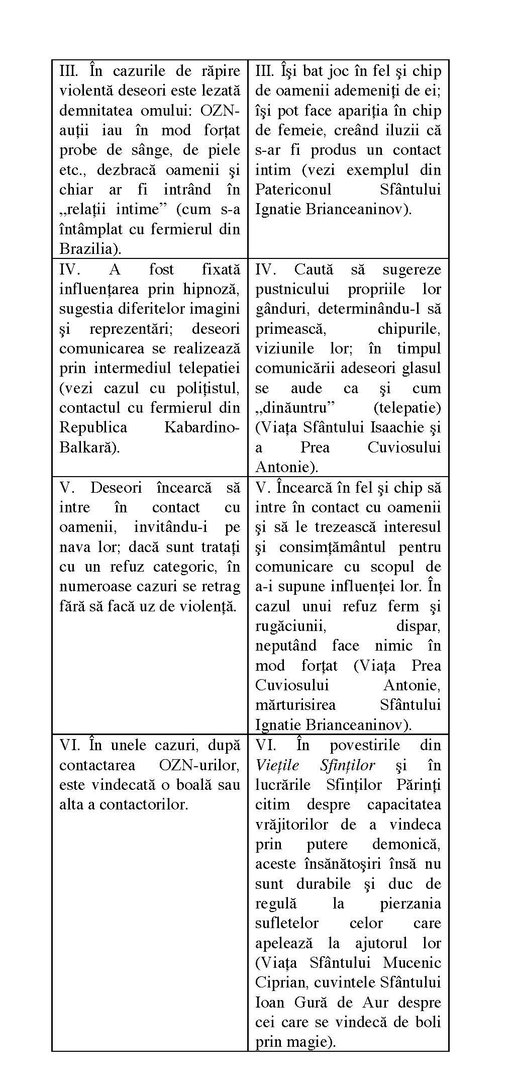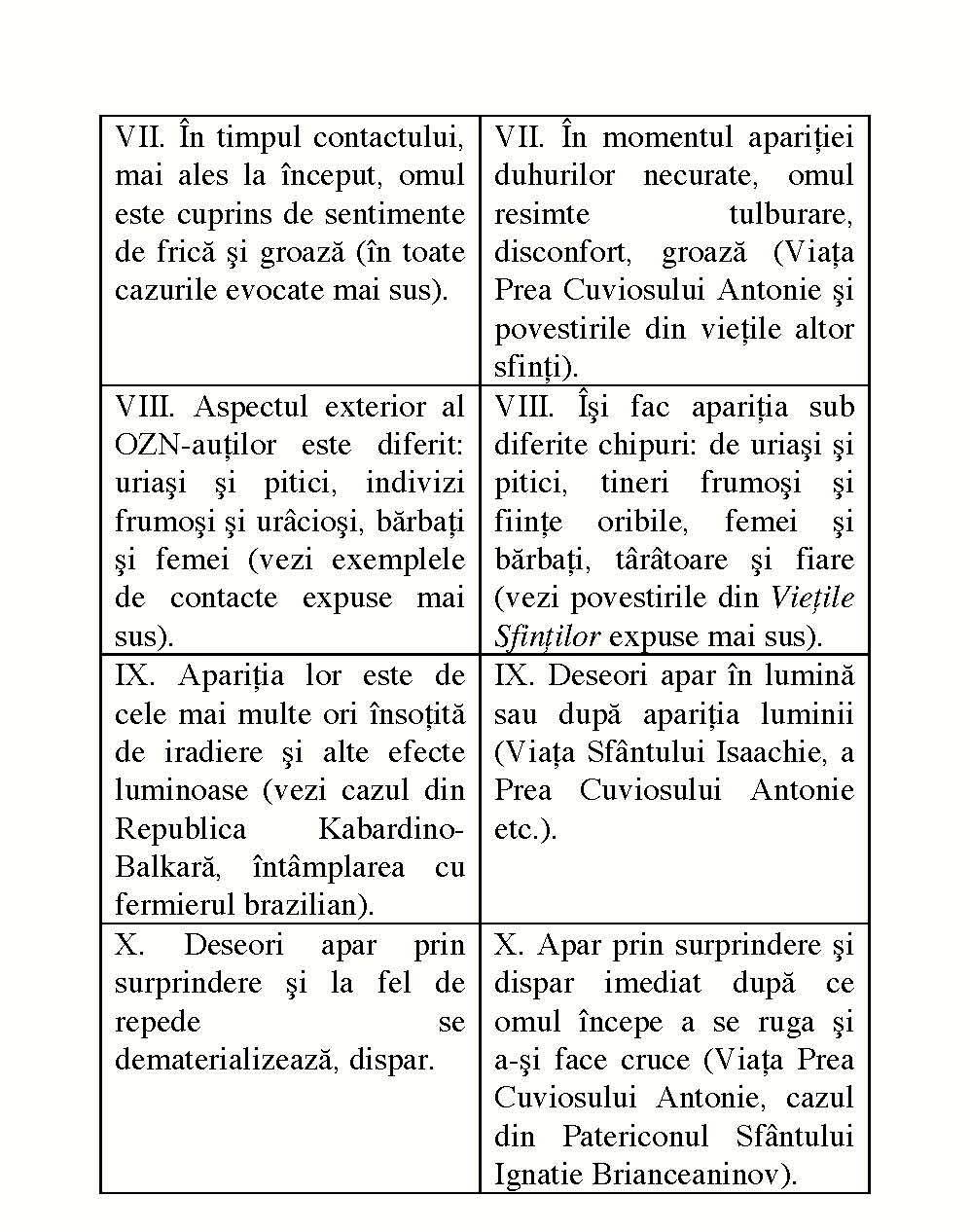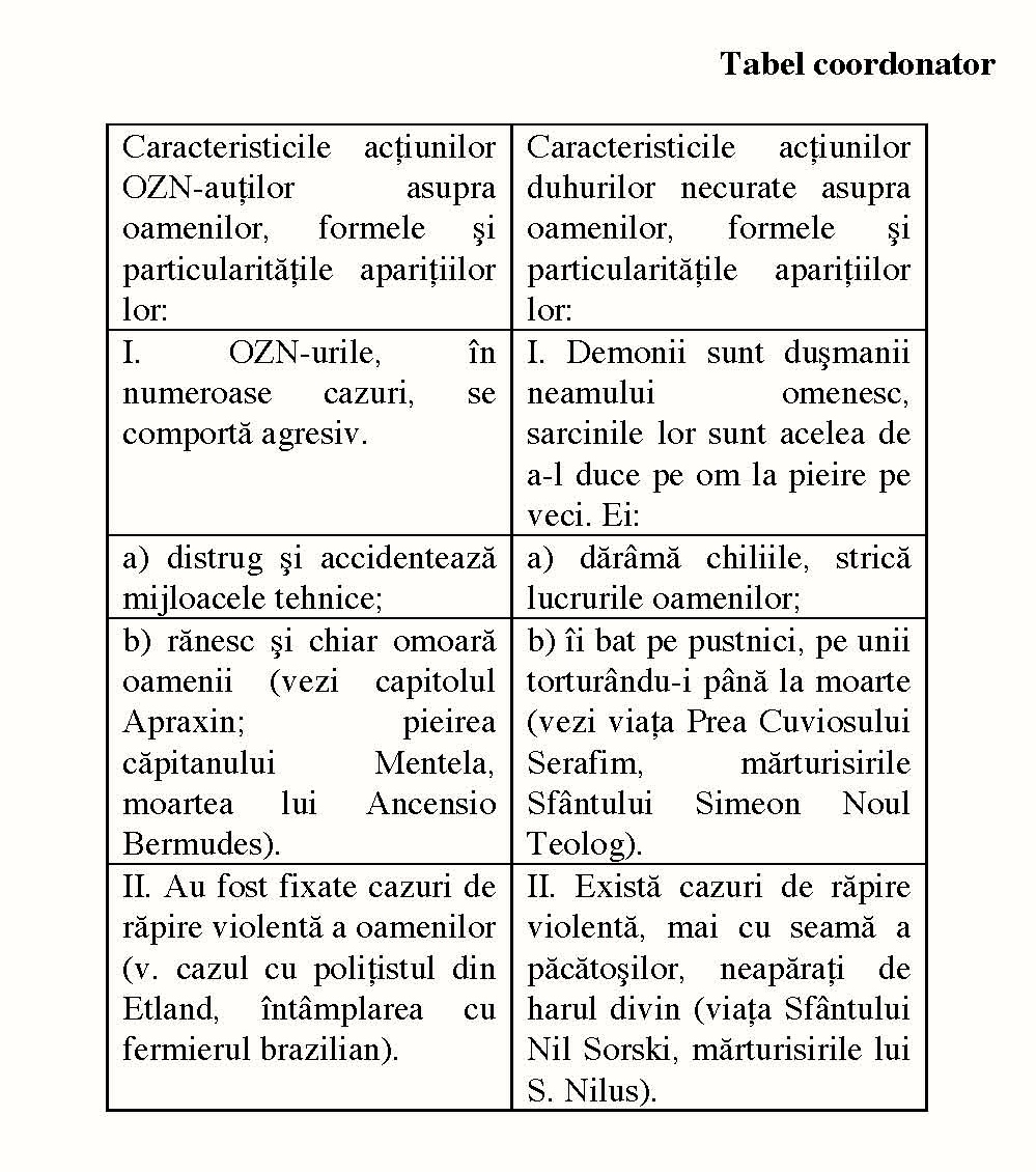 Făcând un bilanț al tuturor celor expuse mai sus, propunem atenției cititorului nostru un tabel coordonator, în care sunt prezentate, în partea stângă, rezultatele analizei contactelor oamenilor cu OZNuri și OZN-auți, însumând 10 caracteristici principale, și -în partea dreaptă -rezultatele felurilor de ispite la care demonii i-au supus pe pustnici, însumând, de asemenea 10 caracteristici.