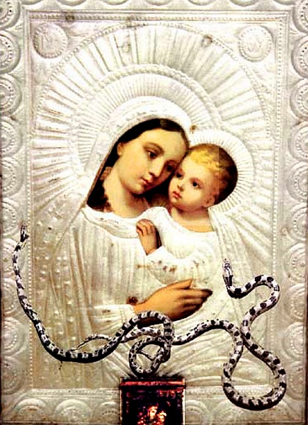 În fiecare an, de Adormirea Maicii Domnului, în bisericile din satele din Insula Kefalonia, șerpi însemnați cu o cruce pe cap și pe limbă, intră în timpul slujbei și se închină la icoanele Maicii Domnului. În tot restul anului șerpii sunt de negăsit.